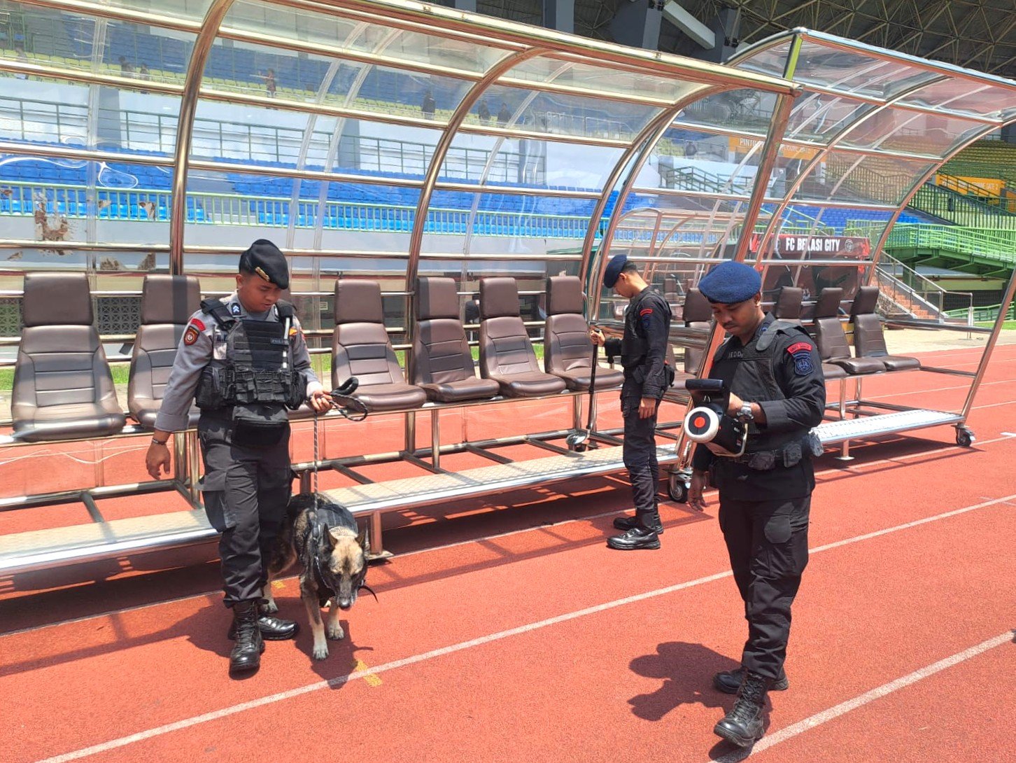 Anjing pelacak dari Unit K9 juga dikerahkan, mengendus setiap sudut stadion guna mencari kemungkinan adanya benda mencurigakan. Hasilnya, seluruh area dinyatakan steril dan aman dari potensi ancaman bahan berbahaya maupun bahan peledak.